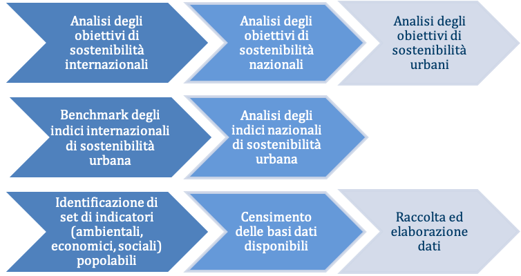 L’analisi che ha portato alla definizione di questo strumento scientifico e di policy si inquadra nel più ampio framework internazionale definito da SDSN per l’individuazione di metriche ed indicatori statistici che misurano le performance delle città relativamente agli SDGs. Il progetto ha mosso i primi passi dall’Agenda 2030 dell’ONU, intersecata con la Strategia Nazionale per lo Sviluppo Sostenibile (SNSvS) e la Strategia Urbana per lo Sviluppo Sostenibile.